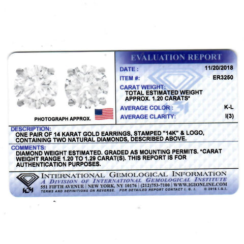 1 1/4 cttw Diamond Studs 14K White Gold IGI Certified Earrings