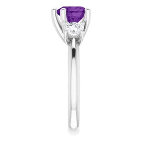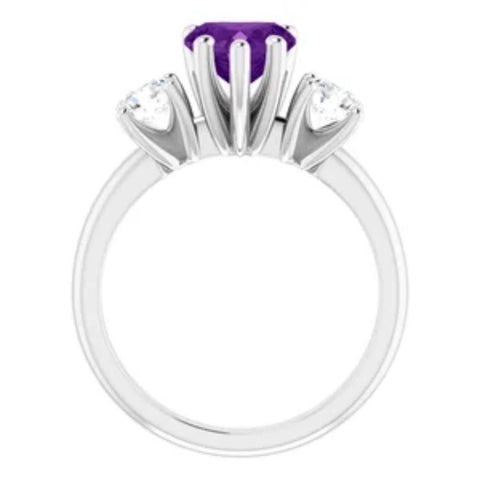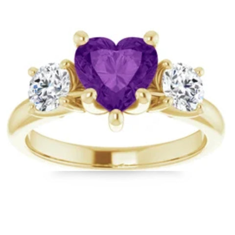 7mm Amethyst Three-Stone Diamond Heart Shape Ring in 14k White or Yellow Gold
