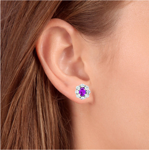 3 Ct Amethyst & Diamond Halo Studs 14k White Gold