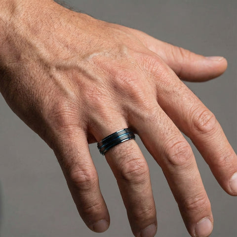 Men's Black & Blue Tungsten Ring Brushed Beveled Step Cut Wedding Band
