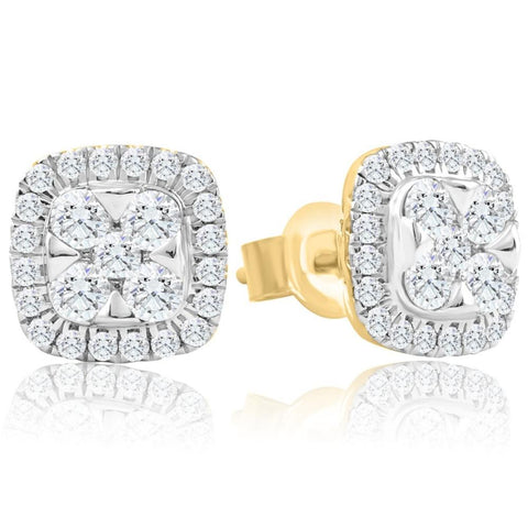 1Ct T.W. Pave Diamond Cushion Halo Studs 10k Yellow Gold Lab Grown Earrings