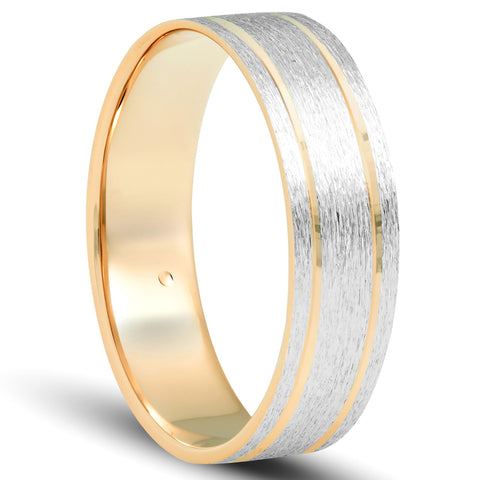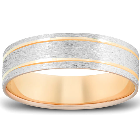 14k Rose & White Gold 6MM Flat Comfort Fit Mens Brushed Two Line Wedding Band