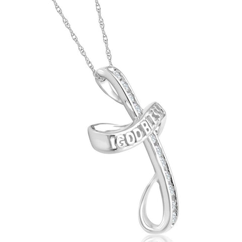 1/3Ct T.W. Diamond Cross 10k White Gold Necklace God Bless You Pendant 18" Chain
