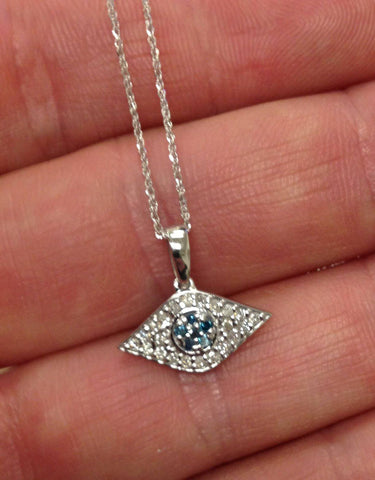 1/4ct Blue & White Diamond Evil Eye Pendant 14K White Gold W/ 18" Chain & Box