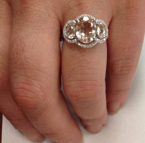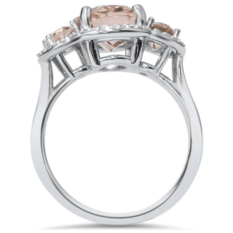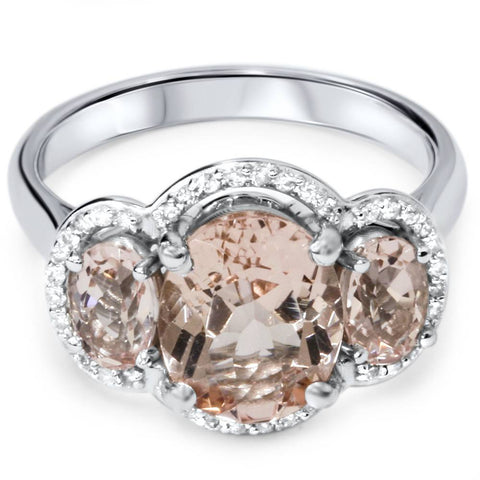 2 3/4ct 3 Stone Oval Morganite & Diamond Halo Ring 14K White Gold