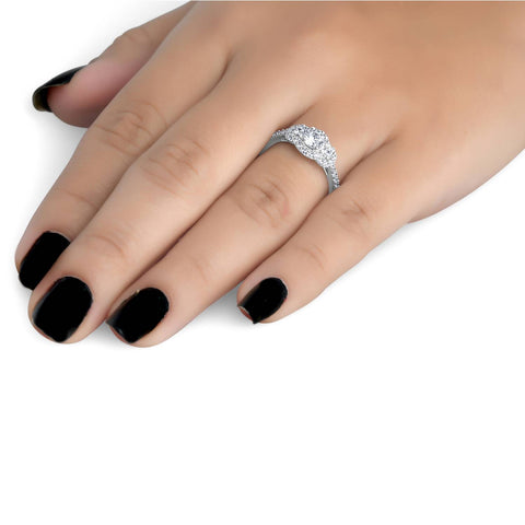 7/8 Carat 3-Stone Halo Diamond Anniversary Engagement Ring Solitaire White Gold